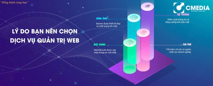 Dịch vụ quản trị website là một giải pháp hiệu quả giúp doanh nghiệp tiết kiệm thời gian, công sức và tối ưu hóa hiệu suất website để đạt được các mục tiêu kinh doanh. Với đội ngũ chuyên gia giàu kinh nghiệm và quy trình làm việc chuyên nghiệp, CMedia cam kết mang đến cho bạn dịch vụ quản trị website tốt nhất, giúp website của bạn luôn hoạt động hiệu quả và tạo ra nhiều giá trị hơn.